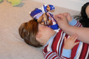 So, Friday we were all playing upstairs. Little and Bubs were on the big bed playing with the Leapfrog and reading a book about cars. (Bubs with Leap, Little with the cars – go figure) I would play with them a bit then go across the hall to put something away in the baby’s room and come back. I left them at one point and within a moment heard Little scream like I’ve never heard. Bubs looked terrified and began crying/screaming in response. Little obviously felt whatever had happened to her and didn’t know how to deal with it and so she started throwing herself down on the bed over and over – – screaming. What did mommy do? PANIC!