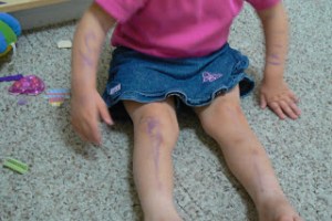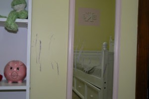 Each day after her nap, Little has “room time” and she listens to her cds, reads her library books, and plays with whatever toys she decideds. This week has been a bit more creative – one day she spread out her diapers all over her room. One day she emptied her wipes out one by one. Friday she drew all over herself and the wall with Memom’s not-so-plastic lipstick! She was devastated that it was a no-no. After correcting her I, of course, took photos for the baby book. Somehow, the pictures don’t really do it justice.