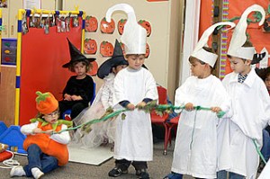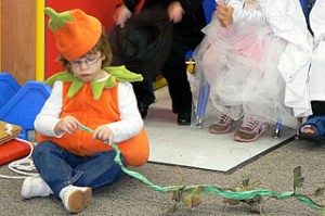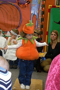 Little had her first school production on Tuesday. Her class performed the book The Big Pumpkin – Little was the big pumpkin. She did great holding her vine throughout the performance and then she stood, threw her arms open wide and said her one line, “Happy Halloween”. She did a great job – I was a proud momma. Of course, Little just wanted it to get over so she could come see KB in her carseat. She was so excited to have KB at her school!