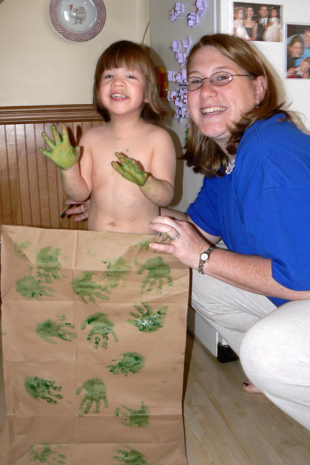 I had to take Thomas to the doctor and Aunt Anna and Little did a painting project. Christmas wrapping paper in the making. I came home to a Green Little and my sister was pretty covered too! Still, they seemed to have a ball.