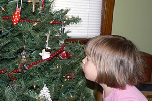 I LOVE this time of year but for the first time EVER I was dreading decorating. I basically have 2 two year olds in my house and actually asked honey if he wanted to place bets on how long the tree will remain standing. To my pure joy, Little’s response to the tree was, “It is GREEEEEN and soo PRREEEETTTTYYY.” Bubba keeps running over to it and saying, “It’s a Christmas tree with twinkle lights. It’s pretty.” So far so good. I keep having them repeat after me, “It is for looking – NOT FOR TOUCHING.” So far so good. Here’s some shots of the decorating festivities.