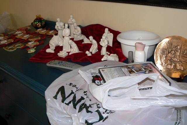 Well, I said I would show you the hutch and explain how it is a picture of our life, so here is the first installment. As one looked at the hutch this past Saturday, they would’ve seen this picture. Ornaments lining one side and filling the white bowl – I am busy making ornaments as gifts for cousins (see entry “Smore Angels, Please!”), teachers, bus drivers, etc. KB’s pacifier is there so that her siblings will not put it in their mouth. There is Mary Kay face moisturizer because Little’s face is so dry that I have been using this good stuff daily. There is lipstick because I keep changing between a diaper bag and purse and keep forgetting to switch the lipstick – so this way I put it on right before I leave no matter what bag I am taking. I don’t know why the TV remote is here or why the decorative plate from the den is now on the hutch. There is a Hilary Duff DVD because Honey was out of town all weekend and I needed brainless media to scrapbook to. And there is a Joanne’s bag because I finally found the fabric for KB’s stocking.