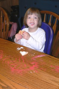 The best part of the whole thing was that I forgot what time it was and looked up to see that KB was crying because it was time to be fed. At this time the cookies were in the “being eaten” phase and everyone was going to be done at any minute – meaning sitting at the table was going to become harder and harder from that point on. So, I went and got KB, put her in her bouncy seat, put Little and Bubba in the tub and fed KB while sitting on the toilet watching the other to play in the tub. What kind of world do I live in?