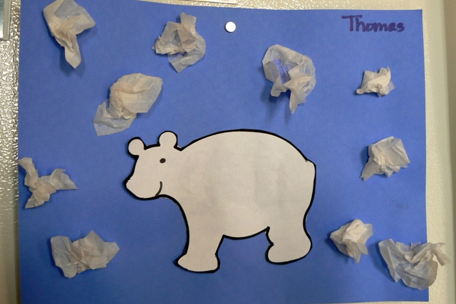 Bubba’s class had a polar bear day last Wednesday. He stuck the tissue paper to the glue all by himself!