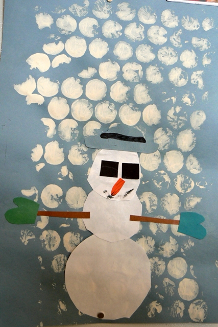 Little’s class did a unit on snowmen last week. Their letter was S, their color was white, and their shape was, strangely enough – rectangles! (whatever) Anyway, here is the artwork she brought home. Notice the fine scissor work on that snowman.