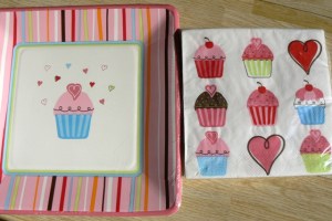 This year is the first time she can talk enough to potentially communicate her desires, and so I asked her what she wanted for her birthday. Now, I meant a princess cake, or books, or some theme but she looked at me and resolutely said, “Chocolate cupcakes”. Since then she has added, “Chocolate cupcakes at school.” So that is what we are doing – I am going to take chocolate cupcakes to school. But, because I have to throw in an element of excitement, I am going to take multiple types of sprinkles in containers for them to decorate their own cupcake (and the teachers get to clean it up – wicked laugh) (no mom, I don’t mean that – I’ll help clean up of course). I found these plates and napkins at Target and am so excited. I’ll have to try and scan the napkin to make a tshirt!!!