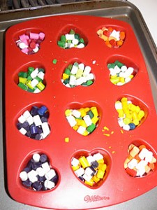 4. Allow oven to preheat to 150 degrees while you keep your children from eating the pretty pea size crayon pieces they should be filling the tin with (you got it – that’s what mine did).