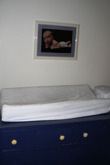 When each of our children were 8 weeks old we had their picture taken in a diaper and we hung it above the changing “table”. Neither of our first two ever noticed it was there.