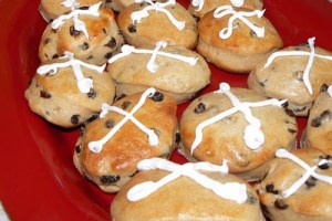 And I made hot cross buns. What a trip. From SCRATCH – used “dry active yeast” and everything. My first time. I mean there was kneading and everything. They were yummy too – I think Little would have eaten nothing else today, if I would have let her. These might become a family tradition! My research (though limited) doesn’t show any deep spiritual significance connecting this bread to Easter, but I don’t think I would have to search too hard to draw significance from the cross covering we who are full of sin, honey is sooo good at that, I’ll ask him.