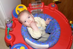 KB was so tired to night she was lying down in her exersaucer. At one point she had her head forward and was in sleeping position – fingers in mouth and other hand on the back of her head.