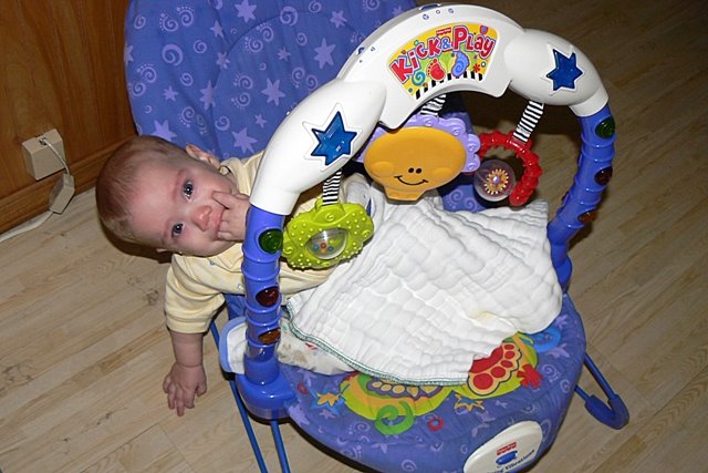 KB does NOT like the bouncy seat anymore! I turned to put my camera down after taking this photo and when I looked back, she was hanging out over the edge even MORE!