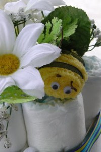 A gal in honey’s office is due to have a baby next month. They had a shower for her and I made my first diaper cake. I was so excited and pleased with how it turned out. I found instructions online and followed line by line – except for the bumble bee; he’s my very own. Emily and Matt decorated the nursery with precious bumble bee bedding and so I made a little bumble bee out of chenille yarn.
