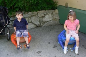 The ONLY reason this next photo is here is to show how my children have become so adept at handling photo ops with mom. I merely said, “You guys could hop up on those frogs and I could take your picture.” And they did. They didn’t smile – they look pretty awful – but they hopped up for the photo. There you go! Now if all of life were just that simple.