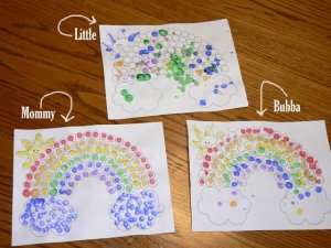 I have become an Oriental Trading fan. VBS was all it took to sell me on their selection and prices for fun artsy stuff. Recently I purchased a few things to do with the kids; this order included Dilly Dot Markers. Of course, I had a coupon (insert grin) so I got the activity sheets to. The kids have had a blast. This was the result of today’s session of “painting”.