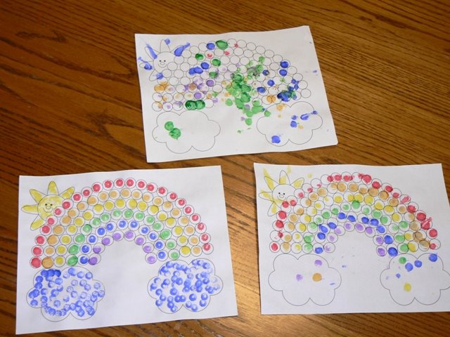 I have become an Oriental Trading fan. VBS was all it took to sell me on their selection and prices for fun artsy stuff. Recently I purchased a few things to do with the kids; this order included Dilly Dot Markers. Of course, I had a coupon (insert grin) so I got the activity sheets to. The kids have had a blast. This was the result of today’s session of “painting”.