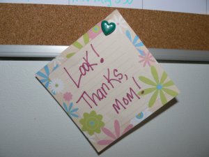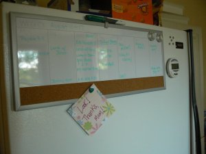 I went to BBB and got my very own weekly calendar wipe board. Turned out the rim was plastic instead of metal and so it was light enough to hang on the frig. So, the kids and I made a trip to Home Depot (where they got to ride in an ORANGE BUGGY – the thrill of simple things) to get super duper magnets and I super glued them on all by myself. Oh yeah, I’m handy. 2 min. later – that’s 30 sec. per magnet – and wahlah! Insto-organized. (I wish)