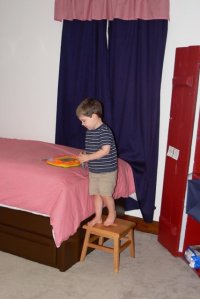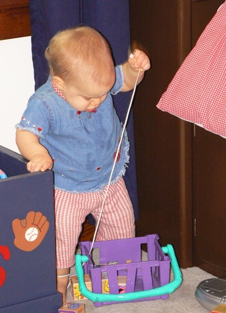 It got quiet the other day and so I went looking to see what trouble the younger two were in. I found Bubba playing with his leap pad in his new favorite place: at the end of the bed, on the stool, rocking back and forth. KB was in the corner playing with the sound machine cord/plug of the sound machine. As you can see, she didn’t like it when I took it away from her.