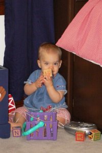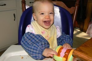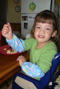 KB has been venturing into the world of finger foods. I am learning that my little one might just be an all or nothing kind of girl. One day she wanted nothing to do with finger foods, yesterday she decided they were worthwhile. Here she is in all her garb and crumb glory. The “sleeves” on her arms are gifts from our Asian family and keep long sleeves from getting dirty; a BRILLIANT invention and wonderful gift I must say.