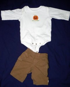 So here is the deal. I am working on my “online yard sale” but, as of tomorrow, this outfit is needing to be worn. Anybody got a newborn “little pumpkin” you want to snuggle up in this cute 0-3M set?