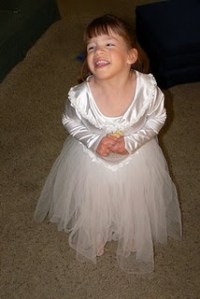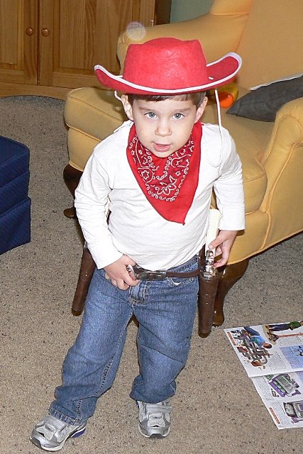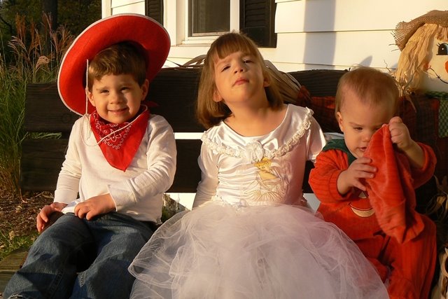 Wednesday, Little’s class had their Halloween play and party (pictures with another post pending)and I forgot to take her costume. EVERYONE else had a costume and she came up to me and actually said, “I want a costume too, mommy.” Sounds normal, eh? So it rocked my world and we headed straight to the class dress-up area and confiscated a Cinderella wedding dress for the remaining festivities. Little was in heaven. She was also in a lot of chocolate throughout the party and in a VERY wet pull-up, so the dress went home with us to be washed. Little has had it on ever since it came off the line and as of 3:00PM today the costume plan was finalized as: Little= Princess; Bubba = Cowboy; KB = Pumpkin.