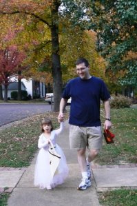 So why “Special Needs Style”? At every house we had to corral the kids so they wouldn’t go IN. We would prompt Little and often times she would respond to the “What do you say to him?” with “THANK YOU” (smart girl) and sometimes with “Trick or Treat. At two houses the folks asked for a trick which threw Little for a loop. She counted to ten at one house and “danced” at another. Folks would ask Little what she was dressed as and she would stare at them. Uncomfortable silence would follow until I gave her the , “You’re dressed as a . . . ” and she would pick up with, “I’m dressed as a princess.”