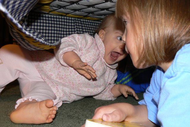 Fridays are long days in the home of the Blue Hutch. No one goes to school, two kids haven’t napped all week, and no one really knows how to play. This past Friday, Little decided she would hide under KB’s crib. Funny enough everyone else decided to go in after her and 3 minutes of Friday was filled with giggles, rolling, tumbling, and pure joy.