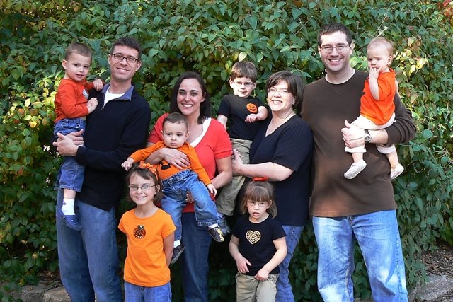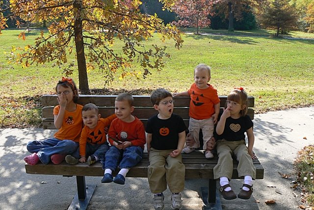 I LOVE this picture. 6 cute kids in Autumn digs – two messing with their noses, one yawning, one standing, one grinning pleasantly, and one leaning forward like he is going to make a dash for it. LOVE IT!