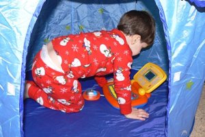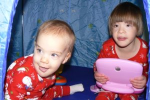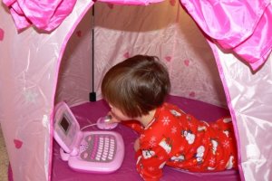My mom starts shopping for Christmas in October – usually. This year she waited a bit longer and when she emailed me for a “suggestion” list, I was ready. I had seen these tents in a catalog for $13 and had shopped around a bit and found nothing I liked nearly as much and nothing as simple and adorable. Memom wasn’t sold on the idea because they didn’t seem bit enough for the kids to go in and really play, but they were way to big to fit anywhere. I wanted them so the kids could have somewhere to disappear and “read”, line up cars, quote the movie “Cars” or whatever. So, Memom ordered them and they were waiting for the children on Christmas morning. We also got Little and Bubba their own laptops. Moments after busting into the living room, this is what we saw (mommy knows best):