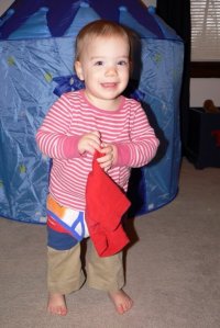 This week she came to me and jabbered away intently and after I said, “Show me what you need, KB.” (Thanks, Amy) she took me to Bubba’s room.  Here she proceeded to empty his underwear drawer, pick out a pair, back up onto my lap hand me the underwear and stick her leg out.  Hilarious.