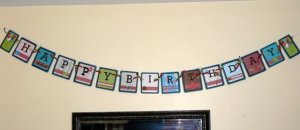 So, I keep seeing precious banners on crafty blogs and thinking, “I could make something like that.” I thought Little’s birthday would be a great opportunity. I downloaded some free digital scrapbook designs that just happened to match my kitchen perfectly and created this little baby.