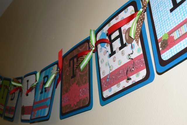 So, I keep seeing precious banners on crafty blogs and thinking, “I could make something like that.” I thought Little’s birthday would be a great opportunity. I downloaded some free digital scrapbook designs that just happened to match my kitchen perfectly and created this little baby.