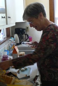 And Memom said, “Let’s get started on this kitchen.” And after a trip to the grocery store for the week’s supplies, the cabinets were emptied, noses were wiped, decisions were made on what to keep and what to store and what to get rid of. Some sewing was done on the curtains. Becky and Memom were in bed by 8:30PM – the second day.