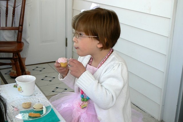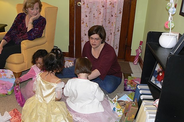 All six little girls from Little’s class showed up last Friday in their dress up dresses and with their mommies in tow. I think only one found our home without a phone call to verify directions and only one was here at 2:00PM (when the party started), but it was really fun. The girls would stand at the window and squeal the others’ names as they arrived. I loved having the mommies in my home and hoped they felt welcome and at ease. Having my own mommy here was a GIFT to me – she thought of all the little things I had forgotten. i.e. how we were going to hang the signs and who was going to serve the food and where would we put the gifts. God was gracious and everything went well. Little had a great time. How do I know? Just yesterday, as we drove down the street, she said to no one in particular, “And ALL my friends came to my house and we wore our dresses. We had so much fun.” Mission accomplished.