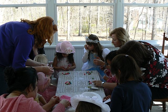 for a bit of craftiness and it was hilarious – all the moms stayed kicked back in the den as though they were going to chat it up while I entertained their kiddies. NO WAY. So, I went in and said, “This is a ‘hands on, mommy’ party! Everybody out to the porch!” They were shocked but followed me out and helped their girls make a necklace to wear home.