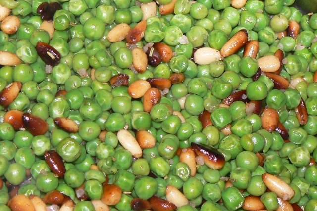 I ran into the kitchen. Pulled the meat out of the crock pot to settle, put water on the stove to boil, whipped up a batch of Pam Eyrich’s Peas (you can get 15 oz. of pine nuts at Sam’s for $7!!!!!), and we were sitting down to eat by 5:30PM.