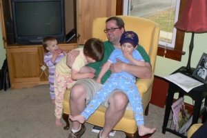 Wow, its like he the refrigerator and the kids are magnets!