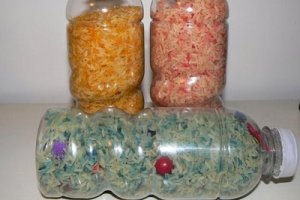 With this in mind, I went shopping earlier in the week for drinks that came in just the right bottle and drank them quickly so that I could wash them thoroughly. This project quickly became a family affair as Little helped me guarantee the bottles were dry with a hair dryer, Bubba found 10 alternate uses for them while awaiting my actual plan for their “lives”, and KB helped dye the rice today. Honey’s role was to provide incessant compliments and he performed that role beautifully!