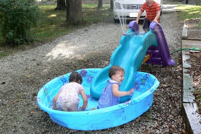 Looks like fun! I have a picture from several years ago with the girls soaking wet in their clothes in the pool, too. Good fun!