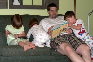 A couple nights ago I had the thought, “If another child crawls on me, falls on me, or sits on me I am going to lose it for good.” So, when it came time for bed I just said, “Climb up on the couch. DADDY is going to read to you.” And he did.