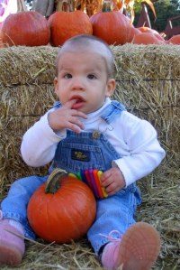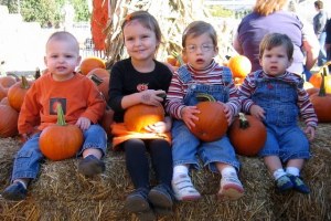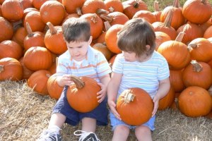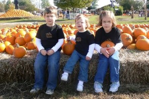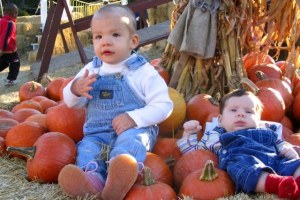 We went to the pumpkin patch on Saturday and I had told Jeremy I wanted to get a couple pictures before the kids ran off and inevitably got covered in the mud left by the previous three days of torrential downpour. I then turned to the children and said, “Why don’t you guys sit on this hay here and let momma take a picture of you?” The hay was covered with pie pumpkins. Little sat down and said, “Sit here, Bubba.” She then picked up a pumpkin and set it in her lap. Her next words were, “Get a pumpkin and hold it, Bubba.” Honey then put KB on the hay and I took the photo.