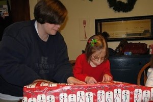 Linda took the kids to McDonalds for lunch and an hour in the Playland and then on to Walmart where Bubba put EVERY car he liked into the buggy. To hear Linda tell the story is classic. She shrugged her shoulders and let him do it. Then she explained that they could only choose TWO. They went and laid everything out on the floor in the aisle and he walked up and down and chose two cars for the mystery five year old. He then put the rest of the cars back on the shelf. (Insert deep sigh of approval and head shake just because that might never really happen so easily again.) After a “no” to a new computer and encouragement from Aunt Linda to choose a doll and an outfit (for the doll), the group came back to our house to wrap the gifts together.