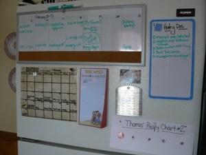 I have the weekly schedule for Honey’s benefit, a pad for a grocery list because my mom says that’s helpful (she’s right), a list of to-do’s for Honey, a chart to track when Bubba poops on the potty, and my new monthly menu chart!