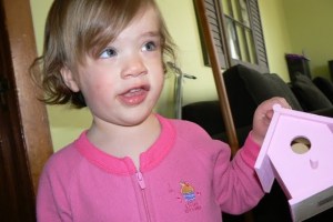 So, we came home and she painted that sucker pink. It is sitting atop her dresser and looking adorable in her pink room. There’s just no bird in this neighborhood that’s going to live in it!