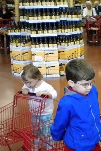 In the next picture you can see one said bottle tower. You can also see two of the many little old ladies who kept peeking around corners to watch us travel through the store. They weren’t quiet talkers and so I heard, “Mae – come look at this.” and “That’s really cute.” And then one said TO ME, “I see what they have in their buggies!!” So glad to know her eyesight was good. (Her comment was actually meant to give guilt. My good Southern upbringing dictated I not tell her to mind her own business. How weird is it that some stranger would start giving input on your life in random places? I digress. . .) I simply responded that the purpose of this trip was for the children to pick snacks for the next week or so and they had risen to the challenge. Good grief.