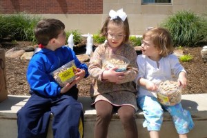 We went back out to the water spouts, beyond the distraction of . . just about anything, and I took a picture of the kiddos with their booty. Bubba picked Schoolhouse cookies (shaped like letters and numbers), Little picked animal crackers, and KB picked tiger cookies. I gave everyone a couple for snack that day and immediately Little said, “I’d like letter cookies.” Bubba said, “I’ll eat tiger cookies.” KB said, “I want animal crackers.” FOR PETE’S SAKE!
