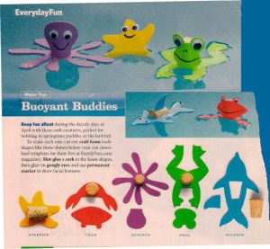 To make these, cut out craft foam body shapes like those in the photo. You can download templates here. Hot-glue a cork to the foam shapes and then glue on the eyes and draw a face.