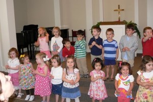 There were long pieces of tape for the kiddos to line up on. This picture shows two classes combined. The front row is KB’s class – 9 girls and Owen.