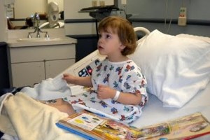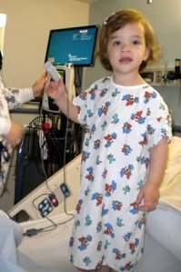 At 7 months, we just took KB in and 15 minutes later we were leaving. This was a half day affair which included our own room, a stylin’ gown for the patient, and free Disney’s Playhouse! Hot Dog!