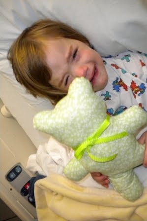 KB was loopy when they brought her back to me. She was snuggly and sleepy and kept asking for her toy. I didn’t have a toy for her, so the nurse went to get a teddy bear she could hold. Now, this teddy bear was just a form with bow (something the women in a nearby church sewed for the children) and when KB saw it her eyes grew wide and she said, “Where’s his eyes?” Then she burst into tears. She would NOT let it go nor would she look at it but just cried and cried, “He needs eyes. Mommy, get his eyes.” Finally I worked out a way for him to go bye bye and he went to sleep under the bed.
