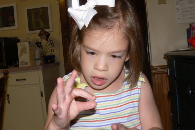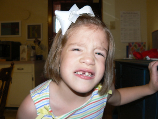 Funny thing? The other front tooth is WAY LOOSE too. Yesterday she told me that it was going to come out and when I asked her if she would like me to pull it out she looked terrified. “I don’t want it to come out,” was her response. She has made several comments that have let me know that, while she is thrilled to have lost a tooth, she is not thrilled about ever having to do it again.